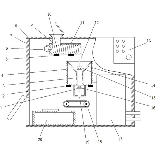 [0023] 参照图1,一种智能节能环保的有机垃圾处理机,包括箱体7、箱盖8和控制盒13,箱体7的上方安装有箱盖8,箱体7的侧边安装有控制盒13,箱盖8的上方设有第一通孔,第一通孔内安装有加料道9,加料道9的底部安装有刀辊轨道11,加料道9与辊轨道11垂直且连通,刀辊轨道11为一端敞口的圆柱体,刀辊轨道11上与敞口相对的一侧设有第二通孔,刀辊轨道11上与敞口相对的一侧安装有第一电机6,第一电机6的输出轴穿过第二通孔连接有刀辊10的一端,且刀辊10呈蜗杆状结构,刀辊10位于刀辊轨道11的内部,刀辊轨道11的底部设有两条平行布置的第一横担5,且刀辊轨道11与第一横担5固定连接,第一横担5的两端分别固定在箱体7两侧的内壁上,刀辊轨道11的底部远离第一电机6的一侧安装有倒置的第一气缸12,第一气缸12的活塞杆的末端安装有第一压块15,第一压块15远离第一气缸12的一端为锥状的凹面结构,第一压块15的下方设有污水盒4,且污水盒4为一端敞口的圆柱体结构,污水盒4内部的底部设有第三通孔,污水盒4内部的底部设有缸套3,且缸套3与第三通孔连通,缸套3的侧边设有第四通孔,缸套3的外侧顶部与污水盒4内部的顶部之间安装有过滤网14,污水盒4的底部设有两条平行布置的第二横担5,且污水盒4与第二横担5固定连接,第二横担5的两端分别固定在箱体7两侧的内壁上,污水盒4的底部安装有第二气缸19,第二气缸19的活塞杆的末端安装有密封板1,密封板1远离第二气缸19的一端设有第二压块16,第二压块16远离密封板1的一端为锥状的凸面结构,污水盒4的侧边底部通过水管连接有油水分离器17,污水盒4的下方安装有传送带装置18,传送带装置18的下方安装有发酵罐20,第一压块15位于缸套3的正上方,第二压块16位于缸套3的正下方,传送带装置18包括传送带、主动轮和从动轮,主动轮的两端和从动轮的两端均安装在箱体7两侧的内壁上,主动轮的一端安装有第二电机,且第二电机位于箱体7的外侧,发酵罐20为微生物生化降解发酵池,发酵罐20的顶部设有进料口,进料口上安装有闷盖,加料道9的顶端设有锥形的漏斗,漏斗的顶端安装有端盖,控制盒13的内部设有芯片,芯片与第一电机6、第二电机、第一气缸12以及第二气缸19电连接,过滤网14为不锈钢金属过滤网。