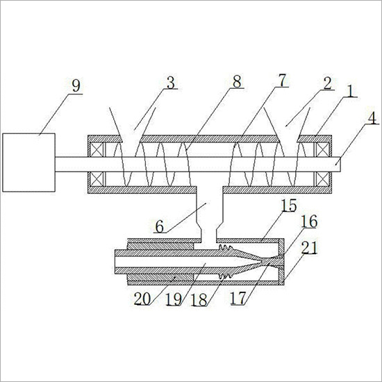 [0019] 通过进料口2进辅料,进胶口3进橡胶,再通过反向螺纹使辅料和橡胶向中间移动,均匀混合,从而提高生产出的橡胶材料质量。当需要生产的橡胶管壁厚或橡胶管内径需要改变时,通过旋转模芯17,使模芯17伸出模套21通孔,在通过螺纹配合更换模芯套16,实现橡胶管内径和橡胶管壁厚改变,避免需要拆卸机头来更换模芯17和模套21,同时还需要调节同轴度,浪费工作时间。以上所述仅为本发明的优选实施例而已,并不用于限制本发明,对于本领域的技术人员来说,本发明可以有各种更改和变化。凡在本发明的精神和原则之内,所作的任何修改、等同替换、改进等,均应包含在本发明的保护范围之内。